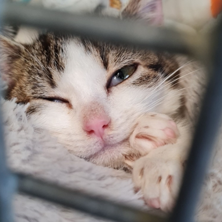 Cette jolie minette se montre douce et câline. Elle adore regarder par la fenêtre et discuter avec les oiseaux.