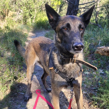 Ce beau malinois aura besoin d'une bonne dépense physique et mentale. Il est tranquille en balade, il ne tire pas et n'est pas réactif.
