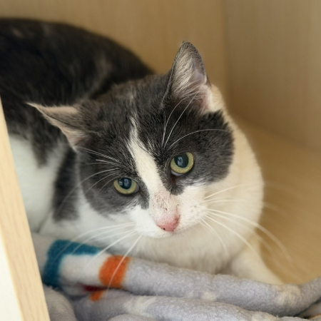 Elle cherche à tout prix le contact avec les autres chats au refuge, de ce fait elle devra vivre avec un autre chat, elle pourra côtoyer des enfants, nous ne connaissons pas ses ententes avec les chiens