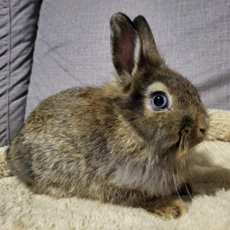 Elle vit actuellement en famille relais avec une autre lapine ( appartenant à la famille relais ) et elle se montre sociable et accepte volontier les caresses. Ses beaux yeux bleu devraient vous faire craquer