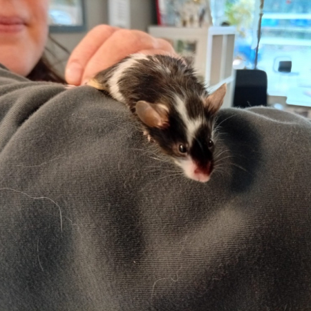 Gertrude est comme ses frères et sœurs , gentil et manipulable. Les souris vivent en collectivité et devront donc être adoptées minimum par 2 . Il leur faudra une cage spacieuse , avec des barreaux peu espacés. Des équipements en bois , des éléments naturels , de quoi se dépenser , grimper , creuser sont indispensables ainsi qu'une alimentation adaptée et de l'eau avec d'autres espéces animales ou la vie extérieure. Fragiles elles ne sont pas compatibles avec de jeunes enfants ,