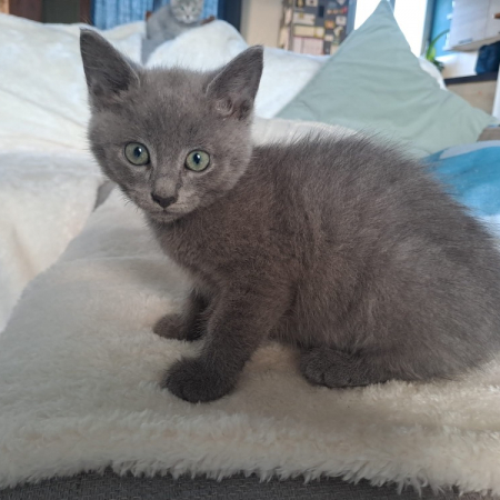 Gribouille est un chat assez timide mais adore les caresses, il faudra un peu de patience pour qu'il se sente à l'aise et le laisser venir de lui même.