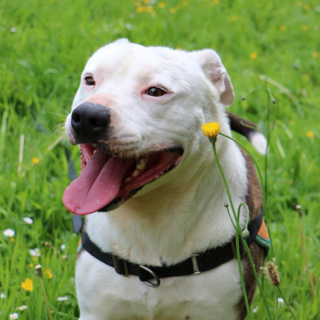 Hydromel est sociable avec ses congénères et il aura besoin d'un compagnon canin bien dans ses pattes pour l'aider à progresser dans le monde des humains.