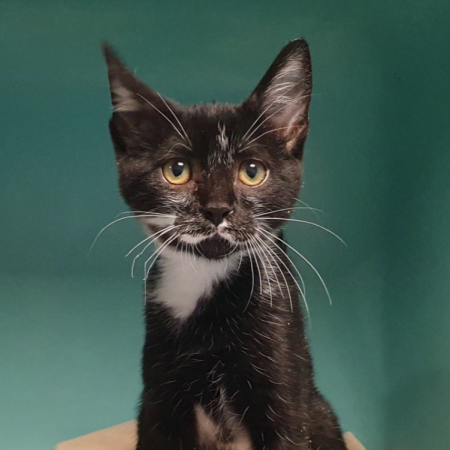 Mitaine à 9 mois. Il est calme et discret. Il s'entend avec les autres chats. Il pourra vivre en appartement. Il faudra lui laisser du temps car pour le moment il ne se laisse pas caresser, car il a encore peur de l'humain.