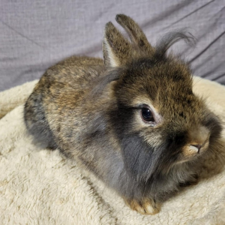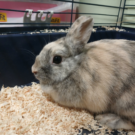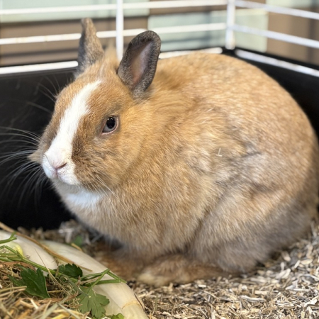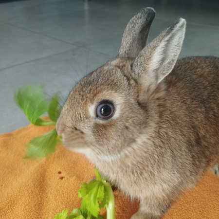Pimprenelle vient d'arriver au refuge. C'est une lapine adorable, affectueuse qui adore se promener dans son enclos et semble être gourmande.