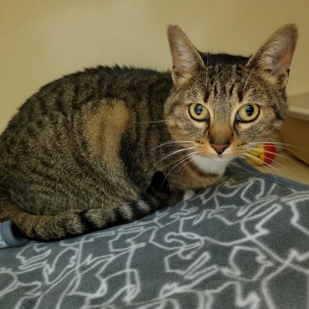 Elle a entre 5 et 6 mois. C'est une jolie tortie calme et gentille. Elle est très fusionnelle avec son frère et l'idéal pour elle serait qu'ils soient adoptés tous les deux ensemble.